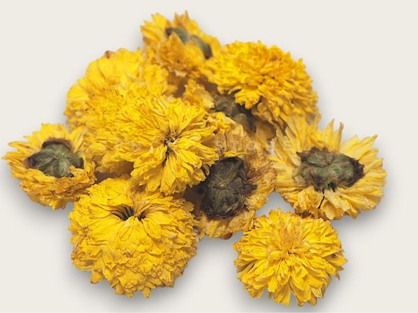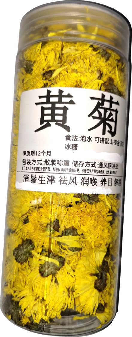 黃菊花是菊科越年生草本。莖蔓長而細柔,葉小有托葉。秋月開花似小球狀,數花成簇,金黃色,花瓣細密為管形,又名滿天星。黃菊花乾品學名:Chrysanthemum,別名壽客、金英、黃華、秋菊、陶菊等,是菊目菊科多年生草本植物的一個屬。黃色的菊花味道稍苦,清熱能力強,常用於散風熱,如果上火,口腔潰瘍,用它泡水能敗火。黃菊花味甘、苦,性微寒,以養肝明目的功效見長,對於因肝火上炎引起的目暗昏花、目赤腫痛、雙眼乾澀等症狀,具有治療作用
